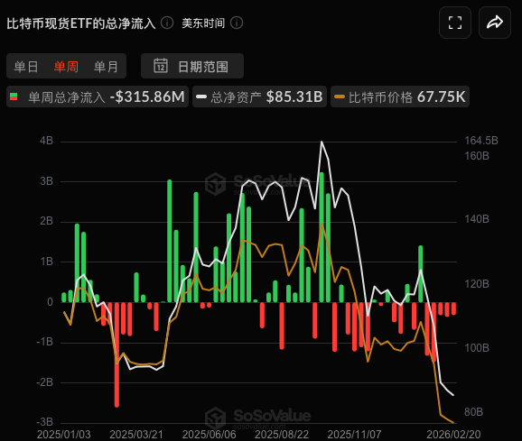 比特币持续区间盘整,截稿前报在67.5K附近。 根据SoSoValue数据,美国现货比特币ETF在上周呈现3.16亿美元的净流出,已连续五周资金流出,为自2025年2月至3月以来最长的连续流出纪录。